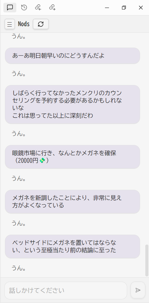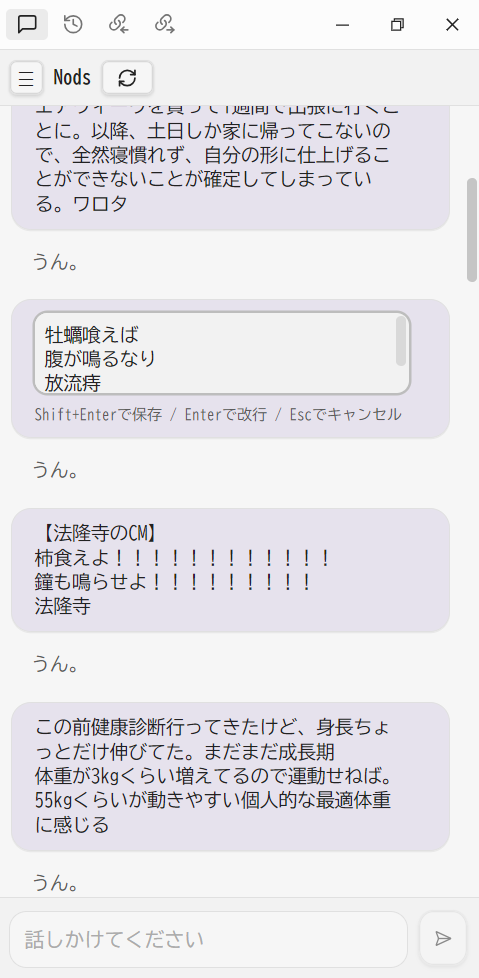 Nods は純粋なつぶやきプラグインというよりも「壁打ち」の側面が強いです。頷いてくれる壁にボールを当ててる感覚ですね。
