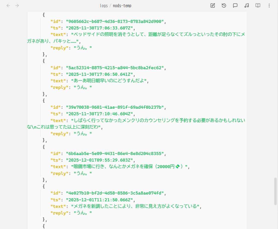 つぶやきのログは、一時ログとして Markdown ファイルに JSON 形式で残ります。