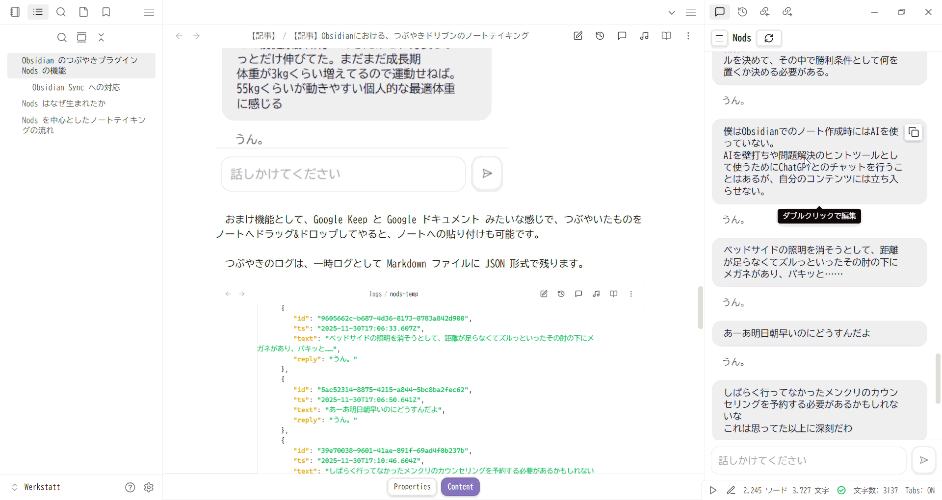 僕は Obsidian Sync を使ってスマホとPC(Windows)の Vault を同期しているのですが、スマホでの Obsidian 使用の8割はこの Nods からのつぶやきです。スマホでつぶやいてどんどんログを貯めていきます。